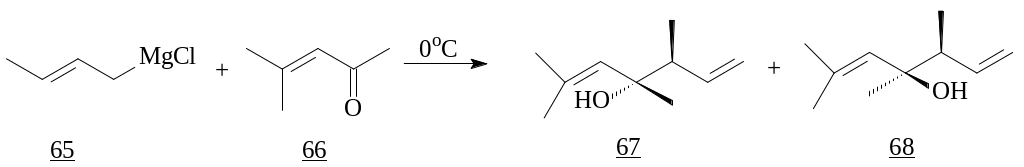 Для нециклических енонов прослеживается иная закономерность. Взаимодействие с кротилмагнийхлоридом (65) при температуре 0°C образует смесь третичных спиртов, с преобладанием trans-изомера (67) с выходом 65% [26].