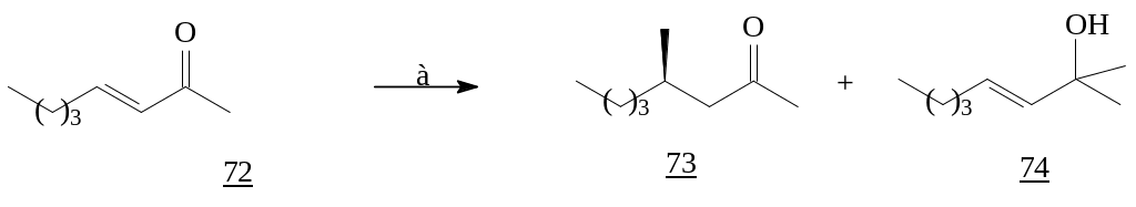 Большое значение имеет способность металлорганических реагентов присоединяться как в 1,2-, так и в 1,4-положение a,b-енонов, поскольку модификацией реагентов и условий взаимодействия можно направить реакцию предпочтительно по одному из двух возможных путей. Для этих целей чаще всего на практике используются реактивы Гриньяра, литий - и медьорганические соединения. В зависимости от условий проведения реакции, реактивы Гриньяра могут давать как 1,2-, так и 1,4-аддукты. RLi-реагенты преимущественно дают продукты 1,2-присоединения, а наилучшими реагентами для 1,4-алкилирования сопряженных циклических енонов являются органические купраты.