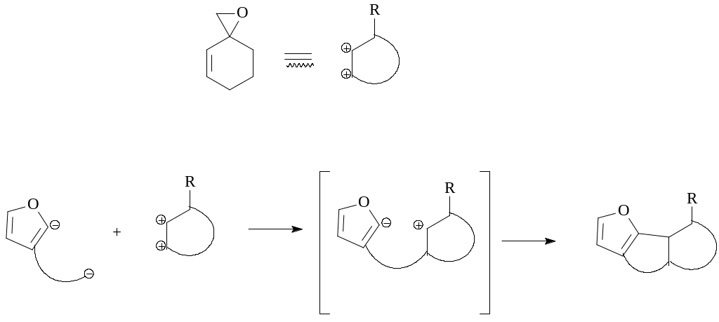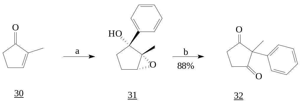 1,2-Присоединение фениллития, синтезированного переметалированием из PhBr и t-BuLi, к 2-метилциклопентенону (30) с последующим эпоксидированием и перегруппировкой привело к образованию 2-метил-2-фенилциклопентан-1,3-диону (32) [11, 12], аддукту реакции Торгова.