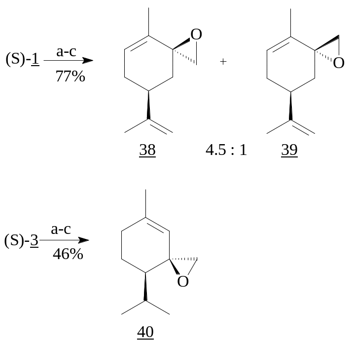 Использование данной методики для енона (S)-(1) привело к смеси эпоксидов (38) и (39) в соотношении 4.5:1, в то время как S-(+)-пиперитон (3) дал один изомер (40) с выходом 90%.