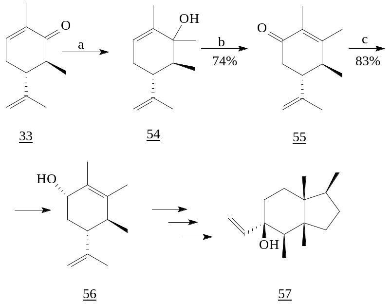 Мягкое окисление выделенного при метилировании trans-6-метилкарвона (33) реактивом Гриньяра спирта (54) дало енон (55), трансформированный в ключевой аллильный спирт (56). Дальнейшее превращение которого ведет к образованию природного сесквитерпена (+)-пингвисенола (57) [13, 28].