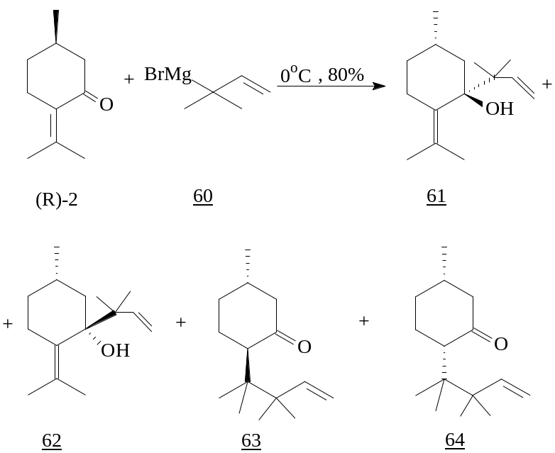 Взаимодействие 1,1-диметилаллилмагнийбромида (60) с (R)-пулегоном (2) дает при 0°C смесь продуктов как 1,2- (61, 62) так и 1,4- (63, 64) присоединения.