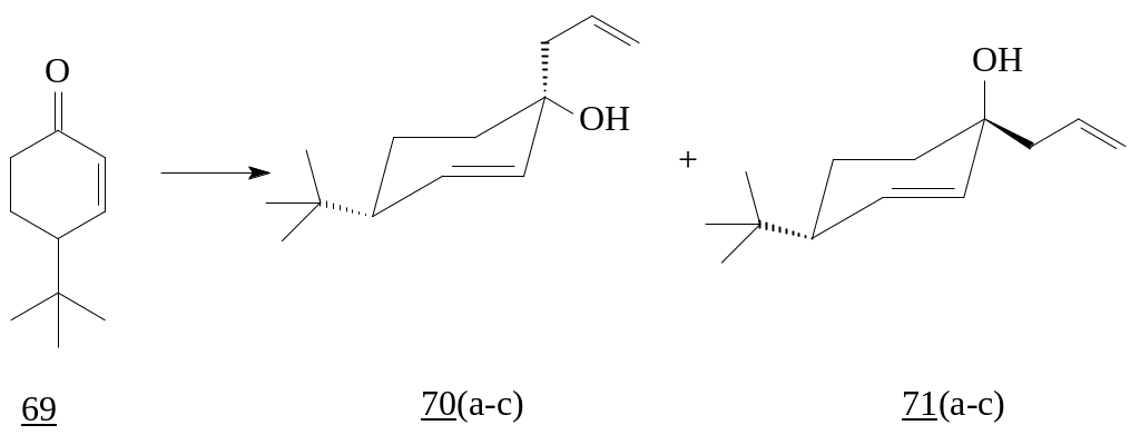 Интересны результаты исследований, полученные Хоуком и сотрудниками, в которых сообщалось о стереоселективном 1,2-присоединении аллилмагния, аллилиндия и аллилвисмута к циклогексенону (69) в аксиальное положение. Это объясняется тем, что 1,2-присоединение нуклеофильного реагента в аксиальное положение энергетически более выгоднее, чем в экваториальное. В результате были получены третичные спирты с преимущественным преобладанием продуктов присоединения алкильных заместителей в аксиальное положение [30, 31].