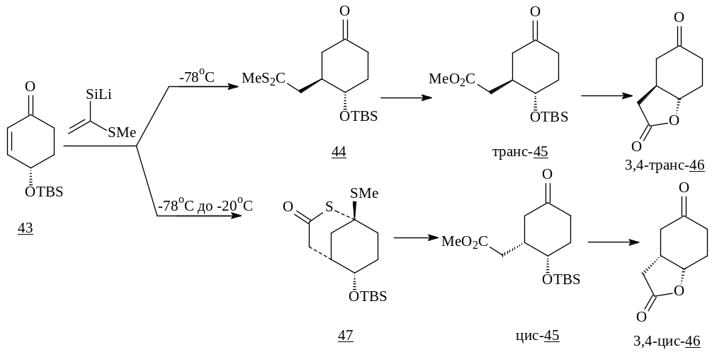1,4-Присоединение Li-енолята к 4-гидроксициклогексенону (43) в зависимости от температурного режима идет с образованием различных изомеров. Таким образом, получают метиловые эфиры 3-оксо-6-OTBS-циклогексанкарбоновых кислот (trans-(45), cis-(45) ) и бициклические кетолактоны (trans -(46) и cis -(46) ) [21].