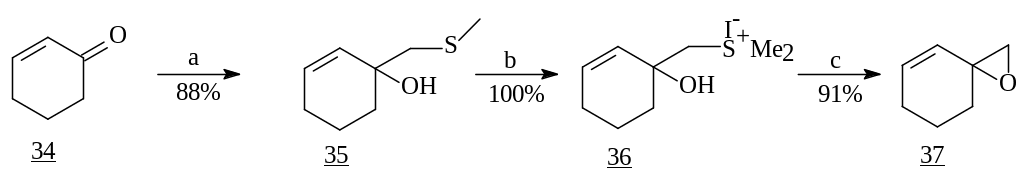 S. Tanis и сотрудники использовали в качестве реагента 1,2-присоединения MeSCH2Li [18]. Последовательным его взаимодействием с циклогексеноном (34) с образованием гидроксисульфида (35), последующим S-метилированием MeI и циклизацией был получен эпоксид (37), который интересен как бис-электрофильное соединение. Реакция бис-электрофилов с бис-нуклеофильным реагентом представляет собой интересный подход к трициклическим продуктам, которые являются ключевыми синтонами в синтезе биологически активных природных соединений [19].
