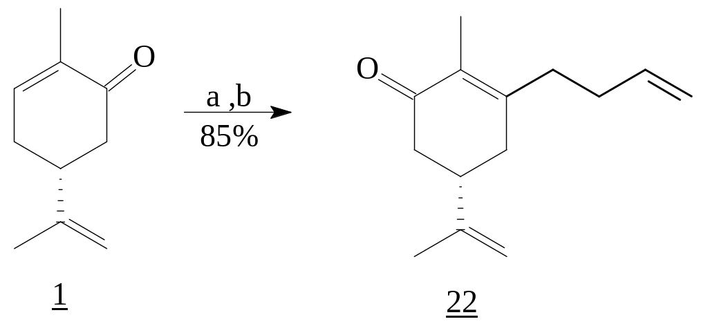 В реакции карвона (R)-1 с 4-бромобутенлитием наблюдается регио- и стереоселективное 1,2-присоединение с образованием третичного аллильного спирта и последующим его окислением Cr(VI). При этом процесс сопровождается аллильной перегруппировкой с образованием -замещенного сопряженного енона (22) [4, 5].