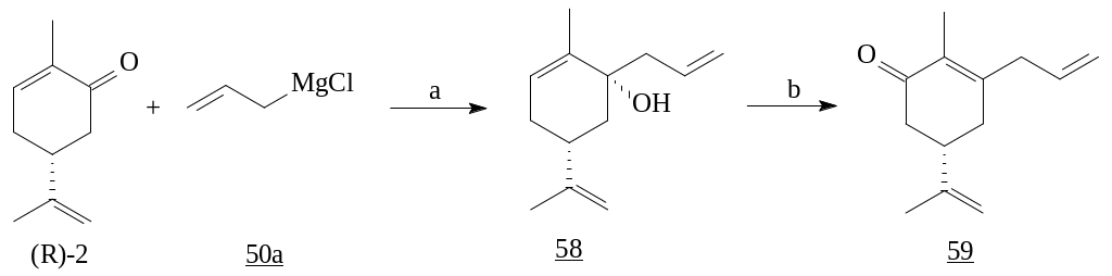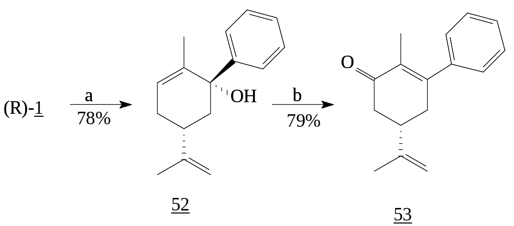 1,2-Присоединение реактива Гриньяра при низких температурах, наблюдается и при взаимодействии (R)-карвона (1) с фенилмагний бромидом, последующее окисление третичного спирта дает фенилзамещенный продукт (53) [27].
