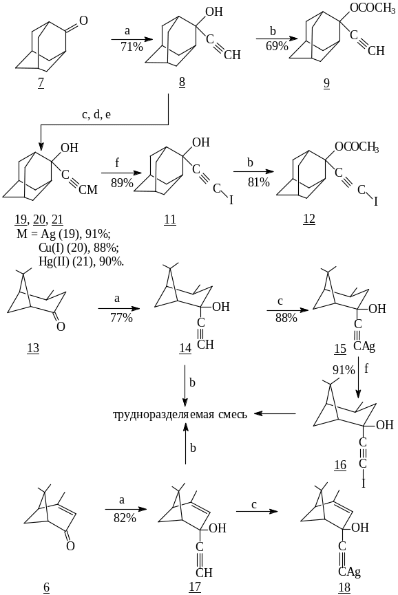 Реагенты: а) HC≡CLi; b) Ac2O; c) [Ag(NH3)2]NO3; d) CuCl; e) K2[HgI4]; f) I2;