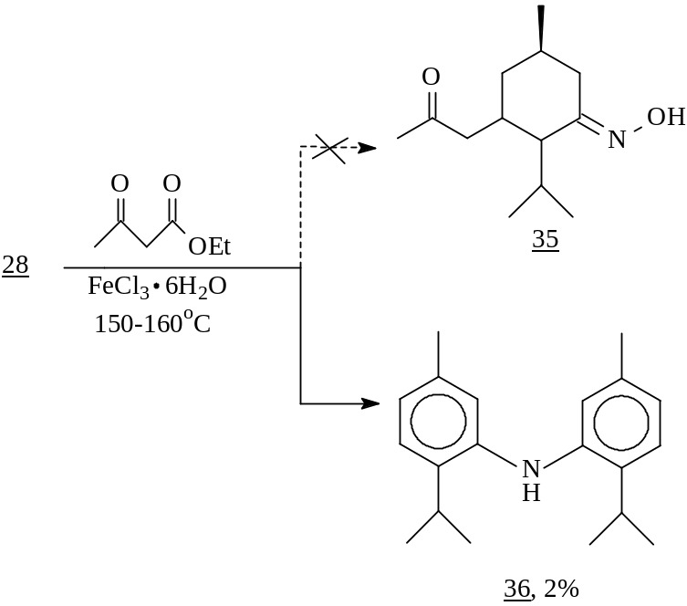 Из работ, проводимых под руководством А. Ткачева, известно, что сопряженные оксимы способны участвовать в реакции Михаэля с образованием бициклических соединений. В связи с этим нами было изучено поведение полученного из ментенона и имеющего уникальную еноновую систему оксима 28 в реакции Михаэля с ацетоуксусным эфиром в присутствии каталитических количеств хлорного железа. Однако вместо желаемого аддукта (35) - азотсодержащего соединения с более широким химическим потенциалом по сравнению с оксимом 28, полученный нами продукт представлял собой сложный устойчивый комплекс с ионом железа (III), о чем свидетельствует вид усредненных сигналов атомов водорода и углерода в спектрах ЯМР 1Н и 13С. К сожалению, выделить в чистом виде удалось лишь минорный компонент, который согласно спектральным данным, представлял собой ди-3-(пара-цимол)амин (36).
