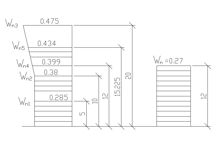 Переменный по высоте скоростной напор ветра заменяем равномерно распределённым, эквивалентным по моменту в заделке консольной балки длиной 12 м: