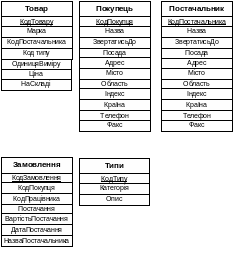 Аналогічно створюються та зберігаються таблиці Замовлення та Товар з ключовими полями Номер замовлення та Код товару відповідно.