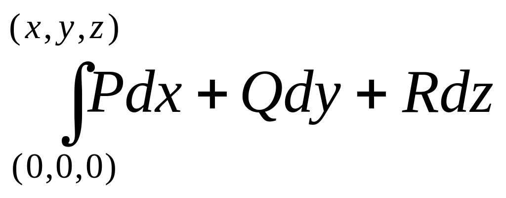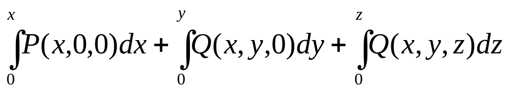 Теперь ищем потенциал. Для этого вычислим криволинецный интеграл от точки (0,0) до произвольной точки (x,y). Так как он не зависит от пути, выберем для простоты ломаную, так чтобы отрезки были вдоль осей