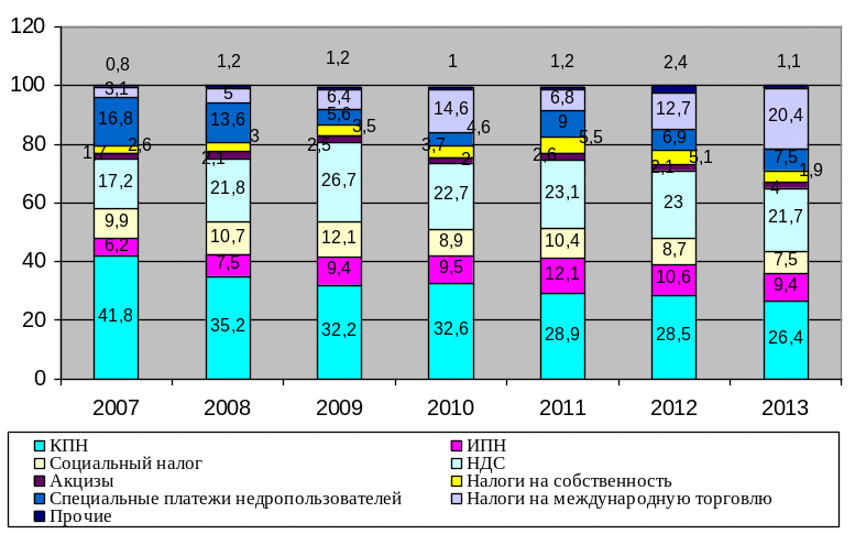 Происходящие в структуре налоговых доходов изменения показали, что наиболее существенные изменения наблюдаются по поступлениям по налогам на международную торговлю и внешние операции и налогам на собственность почти в 2,4 раза, индивидуальному подоходному налогу в 2,2 раза, акцизам на 71,9 % [22].