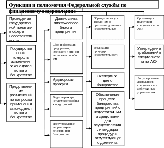 В отличие от судебных процедур банкротства, где роль и влияние органов исполнительной власти существенно ограничены, процедуры финансового оздоровления должны проходить при значительном влиянии государства в лице Федеральной службы по финансовому оздоровлению (ФС ФО). ФС ФО координирует и контролирует первый заместитель Председателя Правительства РФ, в чьей компетенции находятся вопросы управления собственностью, рынка ценных бумаг.