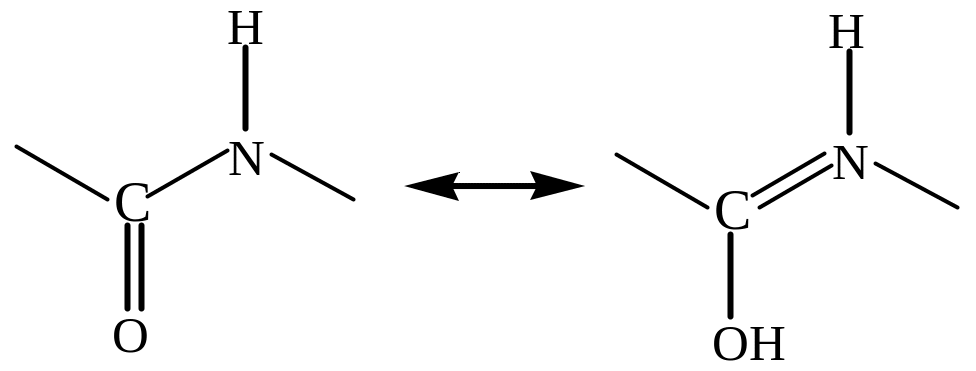- довжина зв'язку між атомами С та N (0,132 нм) є проміжною між довжиною одинарного зв'язку (0,147нм) й довжиною подвійного зв'язку (0,127 нм). Це означає, що пептидна група є трьохцентровою спряженою системою, для якої справедливими є дві резонансні структури (кето-форма і енольна форма):