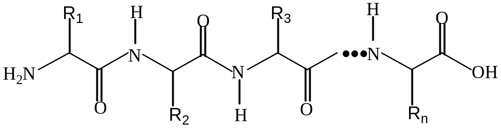 Первинна стуктура – це певна послвдовність залишків α-амінокислот, що утворюють поліпептидний ланцюг, з урахуванням їх кількості і якості. Формують первинну структуру пептидні (амідні) зв'язки:
