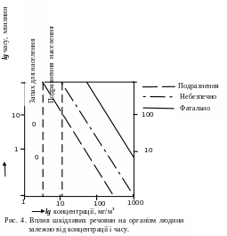 Хронічні отруєння виникають при тривалому впливі речовин проникаючих в організм у відносно невеликих кількостях (концентраціях у повітрі). Розвиток впливу шкідливих речовин залежно від концентрації й часу витримки представлені на рис. 4