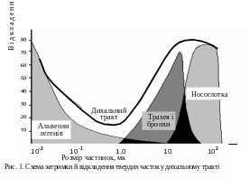 У дихальному тракті частки з розмірами більше 5мк на 75% затримуються й відкладаються верхніми дихальними шляхами (носоглоткою), але 8% найбільш дисперсних досягають альвеол легенів (рис. 1). Потім наступає процес розчинення або видалення з легенів.