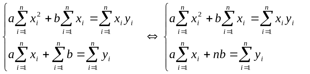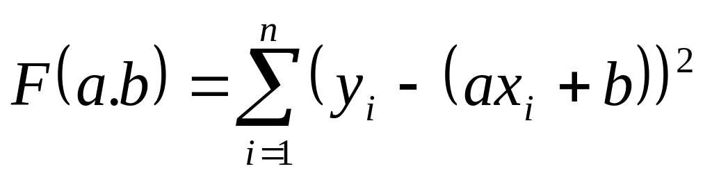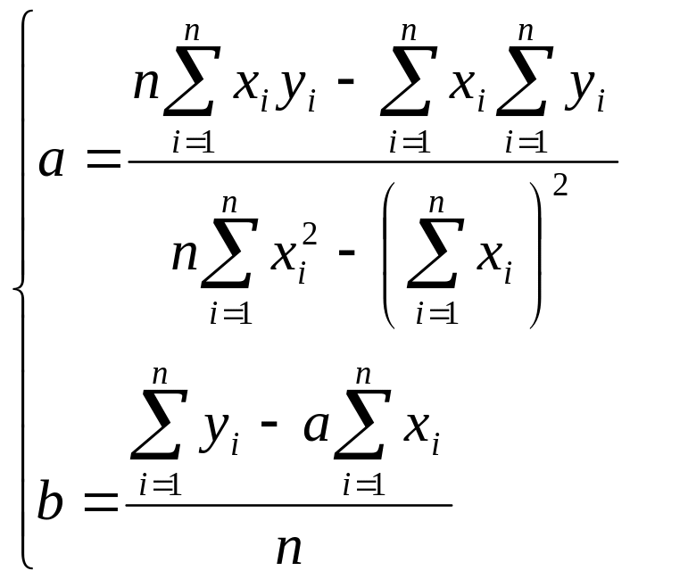 Значения в четвертом столбце таблицы получены умножением значений 2-ого столбца на значения 3-его столбца для каждого номера i . Значения в пятом столбце таблицы получены возведением в квадрат значений 2-ого столбца для каждого номера i . Значения последней строчки таблицы – это суммы значений по столбцам. Используем формулы метода наименьших квадратов для нахождения коэффициентов а и b. Подставляем в них соответствующие значения из последнего столбца таблицы: