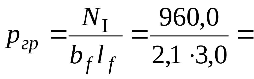 где hc и bc – соответственно, высота и ширина колонны; hc = bc = 0,3 м; NI – расчётная нагрузка, передаваемая колонной на уровне обреза фундамента, NI = f NII = 1,2800,0 = 960,0 кН; f – коэффициент надежности по нагрузке, f = 1,2; – коэффициент, = 0,85; b2 – коэффициент, учитывающий длительность действия нагрузки, b2 = 1,0; b9 – коэффициент, учитывающий вид материала фундамента, b9 = 0,9; Rbt – расчетное сопротивление бетона растяжению, для бетона кл. В20 Rbt = 0,9 МПа, принимается по прил. 1 [14] или прил. 8, табл.8.1 настоящего учебного пособия; pгр – реактивный отпор грунта от расчетной продольной нагрузки NI без учета веса фундамента и грунта на его уступах, определяется по формуле