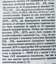 3.Синтезатор частот — устройство для генерации электрических гармонических колебаний с помощью линейных повторений (умножением, суммированием, разностью) на основе одного или нескольких опорных генераторов. Синтезаторы частот служат источниками стабильных (по частоте) колебаний в радиоприемниках,радиопередатчиках, частотомерах, испытательных генераторах сигналов и других устройствах, в которых требуется настройка на разные частоты в широком диапазоне и высокая стабильность выбранной частоты. Стабильность обычно достигается применением фазовой автоподстройки частоты или прямого цифрового синтеза (DDS) с использованием опорного генератора с кварцевой стабилизацией. Синтез частот обеспечивает намного более высокую точность и стабильность, чем традиционные электронные генераторы с перестройкой изменением индуктивности или ёмкости, очень широкий диапазон перестройки без каких-либо коммутаций и практически мгновенное переключение на любую заданную частоту.