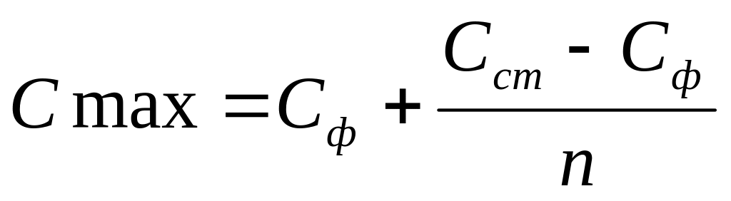 де Смах - концентрація речовини в максимально забрудненому потоці, г/м3; Сф - концентрація речовини у воді вища за випуск стічних вод (фонова концентрація), г/м3; Сст- концентрація речовини в стічній воді, г/м3; n - кратність розбавлення стічних вод на заданій відстані від випуску.