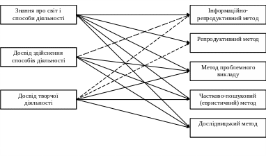 Покажемо схематично зв'язок змісту освіти і методів навчання за характером пізнавальної діяльності. Кожному елементу змісту освіти відповідають свої методи навчання.