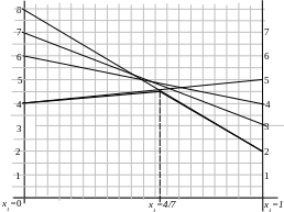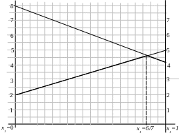 Нижняя огибающая – это пересечение нескольких прямых; выше других пересекаются прямые х1 + 4 и -6х1 + 8.
