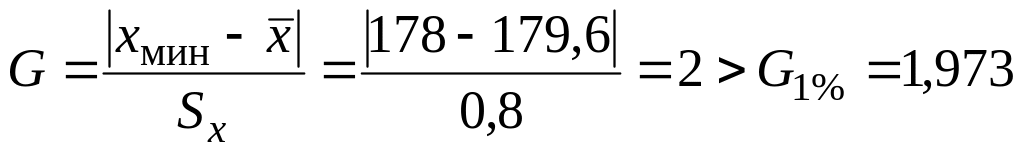 Проверку на промахи проведем в соответствии с критерием Граббса, вычислив статистику Граббса: