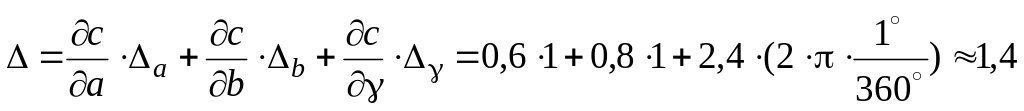 Оцените длину третьей стороны треугольника и границы погрешности полученного результата, если при измерениях длин двух других сторон треугольника получены результаты соответственно 3 и 4 м, а при измерениях угла между ними получен результат 89°. Известно, что в этих измерениях абсолютная погрешность измерений длины не превышает 1 мм, а абсолютная погрешность измерений угла не превышает 1°.