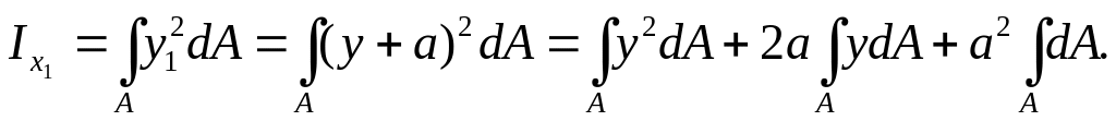 Первое слагаемое правой части есть момент инерции фигуры относительно оси х, т.е. Ix; второе слагаемое содержит статический момент площади относительно оси х, а он равен нулю, так как ось х центральная; третье слагаемое после интегрирования будет равно а2А.