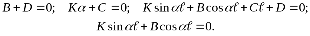 Постоянные К, В, С, D определяются из граничных условий. Например, для третьего случая закрепления (рис. 9.4) при начале координат на нижнем конце имеем ( длина стержня):