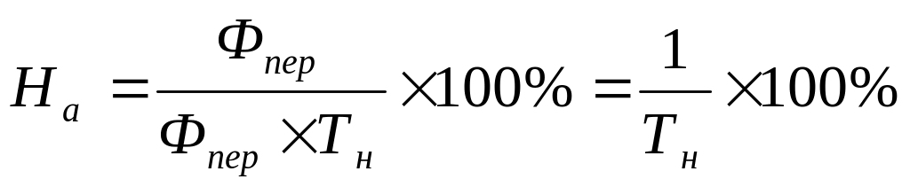 При этом номинальный (режимный) фонд (Тн) представляет собой время работы оборудования, предусмотренное режимом работы предприятия. Оно равно разнице между количеством календарных дней в данном году (Дг) и числом выходных и праздничных дней в этом году (Дn), умноженной на число часов работы оборудования, принятых в соответствии с режимом работы (сменности) конкретного предприятия (tp), т.е.: