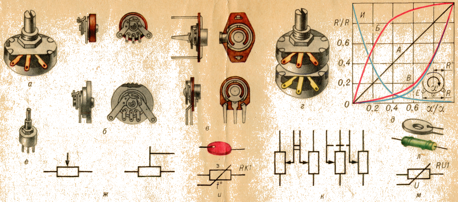 Окрім одинарних, застосовуються здвоєні змінні резистори (г); варіанти УГП їх на схемах показані на мал. к.