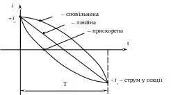 В ідеальному випадку струм у секції змінює напрям на протилежний за лінійним законом. Це – лінійна комутація. Але секція має значну індуктивність (L), тому реальна комутація – сповільнена (рис. 6.4).