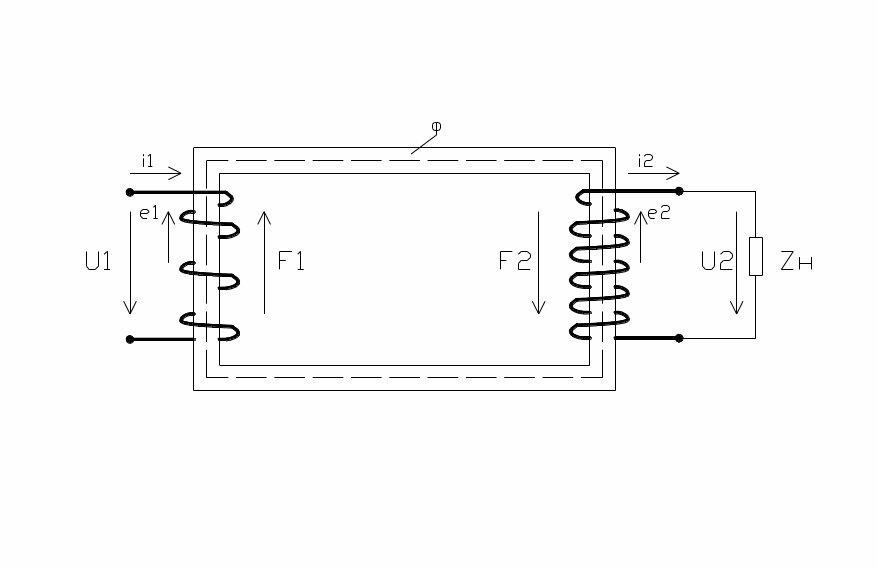При живленні первинної обмотки від джерела синусоїдальної напруги U1 струм первинної обмотки і1 викликає в магнітопроводі синусоїдальний магнітний потік Ф, який, пронизуючи обмотки з кількістю витків W1 та W2, збуджує в них (згідно із законом електромагнітної індукції) ЕРС е1 і е2.