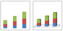 Линейчатые диаграммы с накоплением и объемные линейчатые диаграммы с накоплением Линейчатая диаграмма с накоплением показывает вклад отдельных величин в общую сумму. В объемных линейчатых диаграммах с накоплением используются объемные горизонтальные прямоугольники; в таких диаграммах нельзя вывести данные в трехмерной проекции.
