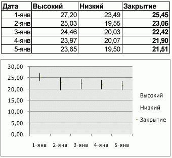 Данные, расположенные в столбцах или строках листа в определенном порядке, можно представить в виде биржевой диаграммы. Как следует из названия, биржевые диаграммы чаще всего используются для иллюстрации изменений цен на акции. Однако их также можно использовать для вывода научных данных. Например, с помощью биржевой диаграммы можно представить дневные или годичные колебания температуры. Для создания биржевой диаграммы необходимо правильно упорядочить данные.