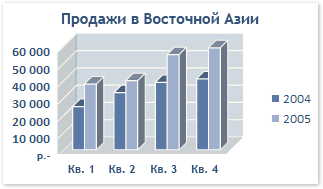 Примечание Чтобы представить данные в трехмерном виде, при котором используются три оси (горизонтальная ось, вертикальная ось и ось глубины) и который можно изменить, используйте подтип объемных гистограмм.