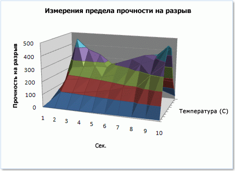 Объемные поверхностные диаграммы Диаграммы этого типа показывают изменение величин по двум измерениям в виде поверхности. Цветные полосы на поверхности не являются рядами данных — они представляют различия значений. На диаграммах этого типа данные можно представить в трехмерном виде, который можно рассматривать как резиновую пленку, натянутую на трехмерную гистограмму. Обычно такие диаграммы используются для отображения отношений между большими объемами данных, которые трудно продемонстрировать иначе.