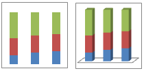 Гистограмма с накоплением и объемная гистограмма с накоплением Гистограммы с накоплением показывают отношение отдельных составляющих к их совокупному значению, сравнивая по категориям вклад каждой величины в общую сумму. Гистограмма с накоплением представляет значения в виде плоских вертикальных прямоугольников с накоплением. Объемная гистограмма с накоплением показывает эти же данные только в трехмерном виде. Третья ось значений (ось глубины) не используется.