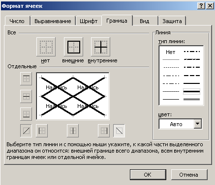 Можно применять к выделенным ячейкам несколько типов границ одновременно.