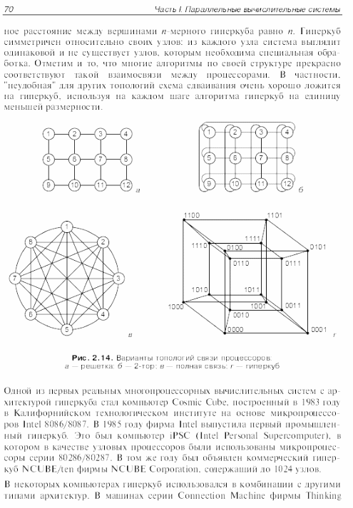 Кейде ерекше қызық нұсқалар табылады, соның бірі екілік гиперкуб топологиясы (18, г - сурет). n - өлшемді кеңістікте бірлік n - өлшемді кубтың тек төбелерін ғана қарастырамыз, яғни, хі координаталарының бәрі 0-ге немесе 1-ге тең (x1,x2,…,xn) нүктелері. Осы нүктелерге шартты түрде жүйе процессорларын орналастырамыз, әр процессорды жақын тұрған тікелей көршісімен әрбір n - өлшемді жағалай байланыстырамыз. Нәтижесінде N=2n процессордан тұратын жүйе үшін n - өлшемді куб аламыз. Екі өлшемді куб жай шаршыға, ал төртөлшемді нұсқасы шартты түрде 18, г-суретінде бейнеленген. Гиперкубта әрбір процессор тікелей log2N көршісімен байланысқан (толық байланыс жағдайында N көрші процессорлармен). Гиперкубтың пайдалы қасиеттері көп. Мысалы, әр процессор үшін олардың барлық көршілерін анықтау қиын емес: олар одан қандай да бір хі координатасының мәні бойынша ажыратылады. n-өлшемді гиперкубтың әрбір «қыры» n-1 өлшемді гиперкуб болып табылады. n-өлшемді гиперкуб төбелері арасындағы максимал арақашықтық n-ге тең. Гиперкуб өзінің тораптарына қатысты симметриялы: әр тораптан жүйе біркелкі болып көрінеді және арнайы өңдеуді қажет ететін тораптар болмайды. Көптеген алгоритмдер өз құрылымы бойынша процессорлар арасындағы осындай өзара байланысқа жақсы сәйкес келетінін айта кету керек.