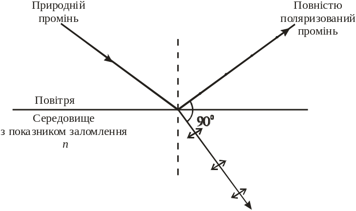 При цьому відбитий і заломлений промені виявляються взаємно перпендикулярними (рис.4). Для скла, наприклад, кут поляризації =570.