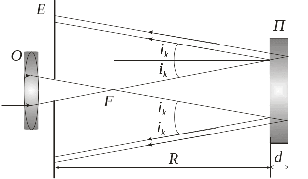 Високий ступінь монохроматичності світла, яке випромінюється лазером, дозволяє спостерігати інтерференційні смуги рівного нахилу при великій різниці ходу. Для цього використовують світловий пучок з великою розбіжністю, яким освітлюють плоскопаралельні пластинки. Об’єктив мікроскопа О (рис.3) збирає світловий пучок в фокусі F. Світловий конус, який розходиться з фокуса, падає на скляну пластинку П. Відбитий від передньої і задньої грані пучок дає на екрані інтерференційну картину концентричних кілець рівного нахилу. Кути ік, під якими спостерігають мінімуми відбитого світла, визначаються умовою: