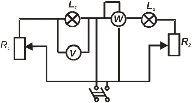 Установка складається з фотометричної лави, на кінцях якої розташовані еталонна лампа L1, сила світла якої при певній напрузі струму відома, і досліджувана лампа L2 (рис.2). Між ними міститься фотометрична головка. Для усунення впливу розсіяного світла з боку зовнішніх предметів на кінцях і в середині лави встановлені спеціальні екрани з отворами. Для визначення потужності електричного струму, який розжарює нитку лампи, використовують ватметр. Він вмикається в коло досліджуваної лампи за схемою, зображеною на рис. 3. R2 – реостат, призначений для зміни розжарення нитки лампи. Для підтримання постійної напруги на еталонній лампі в її коло ввімкнено реостат R1, а напруга на ній контролюється вольтметром V.