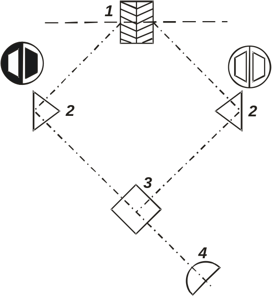 Для фотометричних вимірів використовують фотометричну головку (див. рис.3). Світло, відбите поверхнями пластинки, направляється призмами 2 через фотометричний кубик 3 з контрастними полями в окулярну трубку головки 4. При фотометричній рівновазі, коли яскравість обох сторін приймальної пластинки головки однакова, видиме в окуляр поле має вигляд, зображений на рис.3, з правого боку.