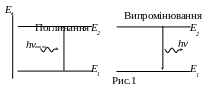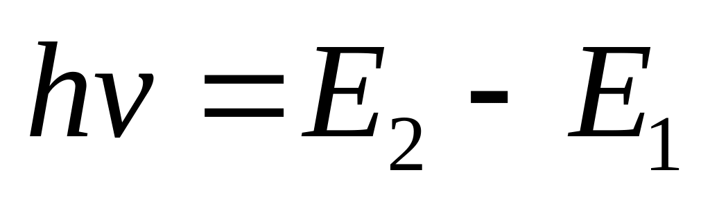 випромінювання і поглинання енергії може відбуватися тільки при переході електрона з одного стаціонарного стану (рівня) Е1 в інший Е2. При цьому енергія фонона hv, який випромінюється або поглинається, дорівнює різниці енергій початкового і кінцевого станів (рис.1):