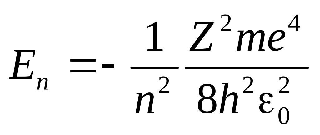 Знак “–“ означає, що електрон перебуває у зв’язаному стані. Зазначимо ще раз, що ціле число n, яке у (7) визначає енергетичні рівні атома, називається головним квантовим числом. Енергетичний стан з n = 1 є основним (нормальним, незбудженим) станом, стани з n > 1 – збудженими. Енергія, що відповідає основному стану атома водню (Z = 1, n = 1), дорівнює –13,55 еВ. Це енергія, яку необхідно надати, щоб вивести електрон за межі атома. Тому її ще називають енергією іонізації.