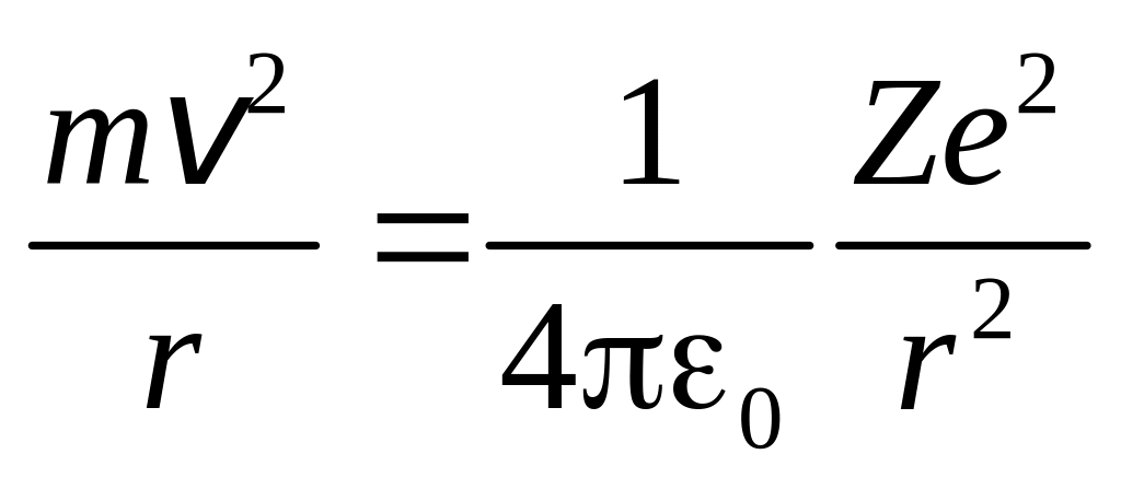 де m – маса електрона; – швидкість електрона; r – радіус дозволеної колової орбіти електрона; n = 1, 2, 3,... – головне квантове число. Оскільки між негативно зарядженим електроном та позитивно зарядженим ядром діє сила кулонівського притягання, то умова рівноваги сили Кулона та доцентрової сили (у вакуумі) запишеться: